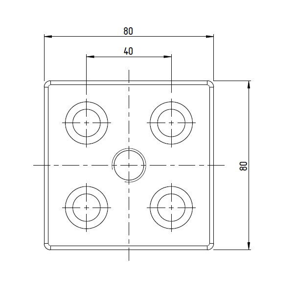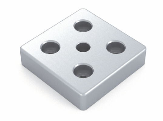 Płyta bazowa 80×80 z gwintem M16 wykorzystujemy do montażu stóp. Płyta mocowana jest czterema śrubami do otworów gwintowanych w profilu.